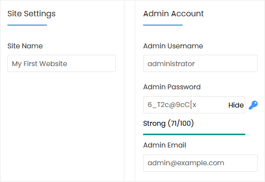 • Admin Username: Your new ImpressPages username (for security reasons, do not use the administrator or the admin username).